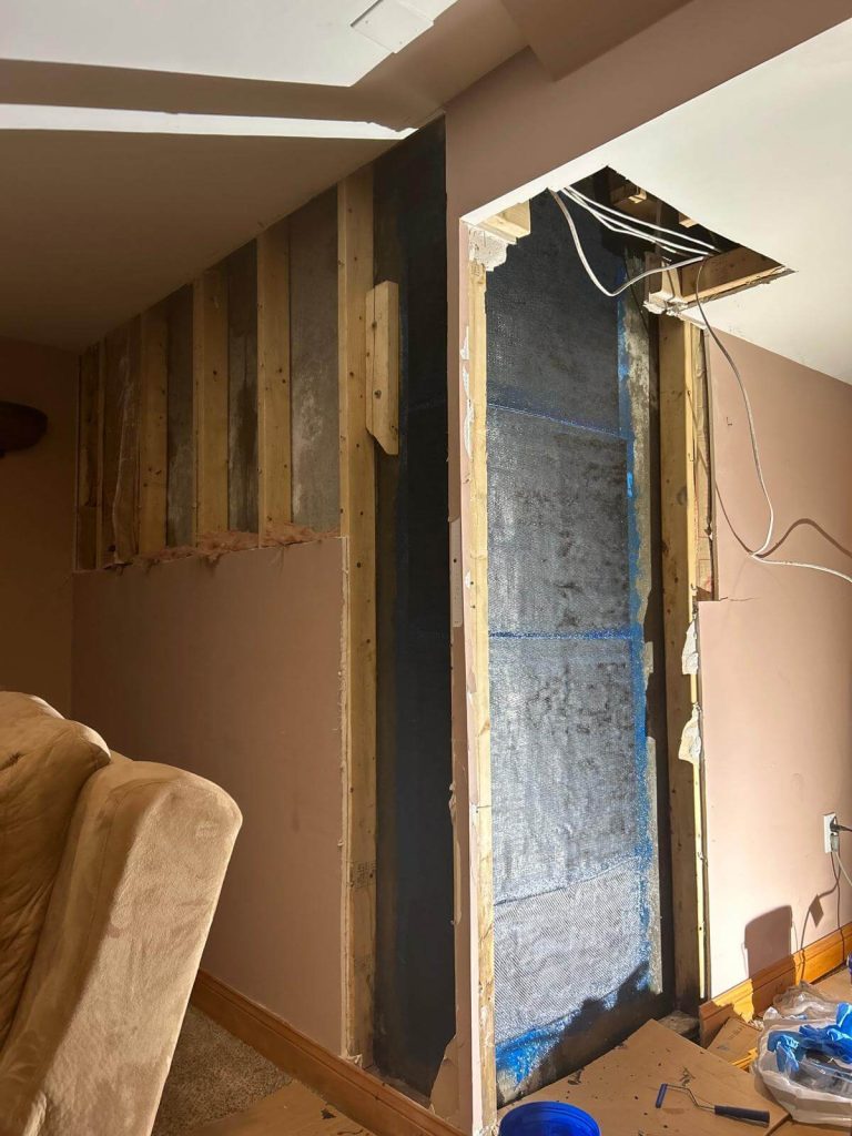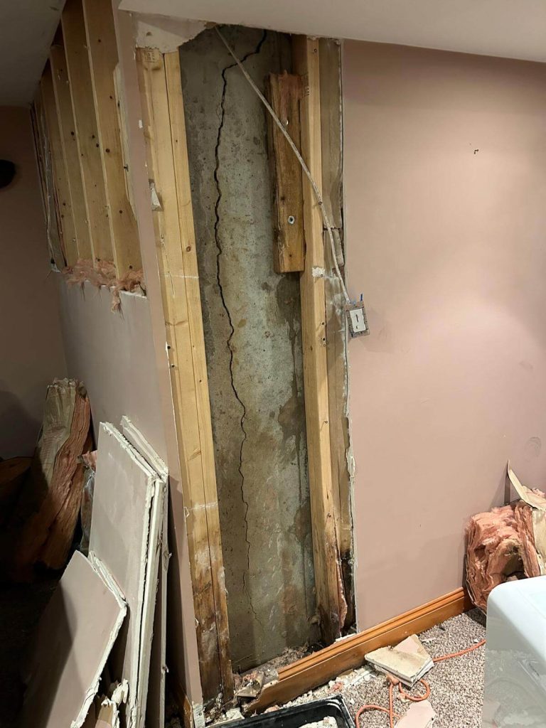Since the crack had already caused moisture intrusion, we reinforced the repair by installing a waterproofing membrane over the affected area. This extra layer of protection ensures that even if minor movement occurs in the future, the wall remains watertight.