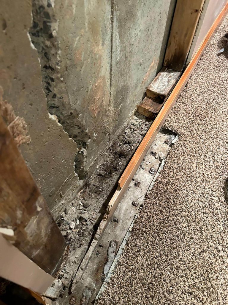 Upon inspection, we discovered that the foundation wall had developed a large vertical crack that extended from the floor to the ceiling. The homeowner had noticed moisture seeping through the wall, damaging the surrounding insulation and drywall. The water infiltration was particularly concerning because: